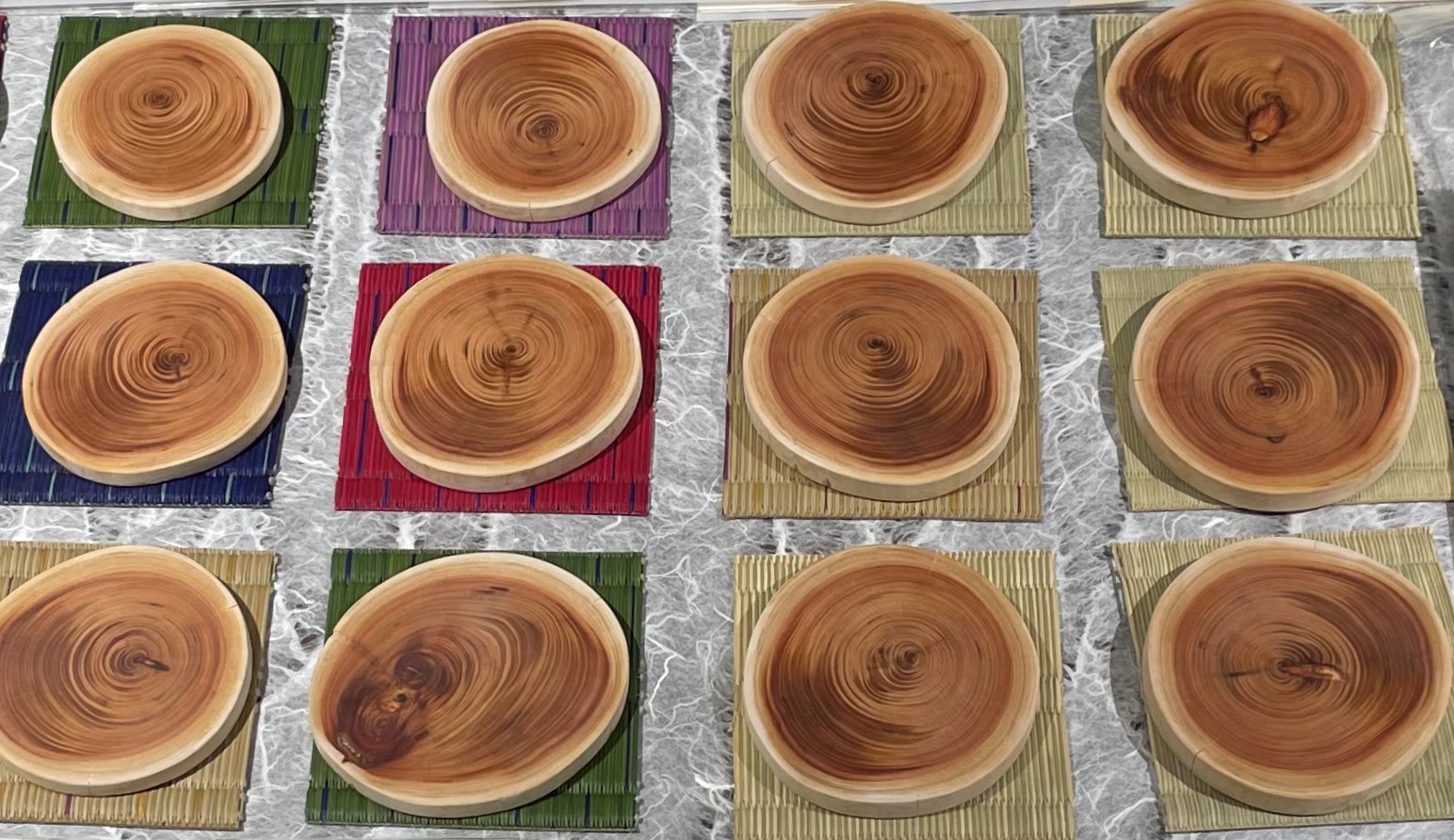 展示自然材の例:掛川織い草/アンモニア消臭、越前和紙/千三百年 持続化可能・無駄が出ない・保温性能・不燃の認定品有、越前漆/お直し可能、有田焼/3世代使用、絹オーガンジー/手触り最高、川根茶/無農薬、漆喰/原石、杉板/安眠促進、突板/不燃仕様有、竹のガーゼ/食材保護、保湿性・・・