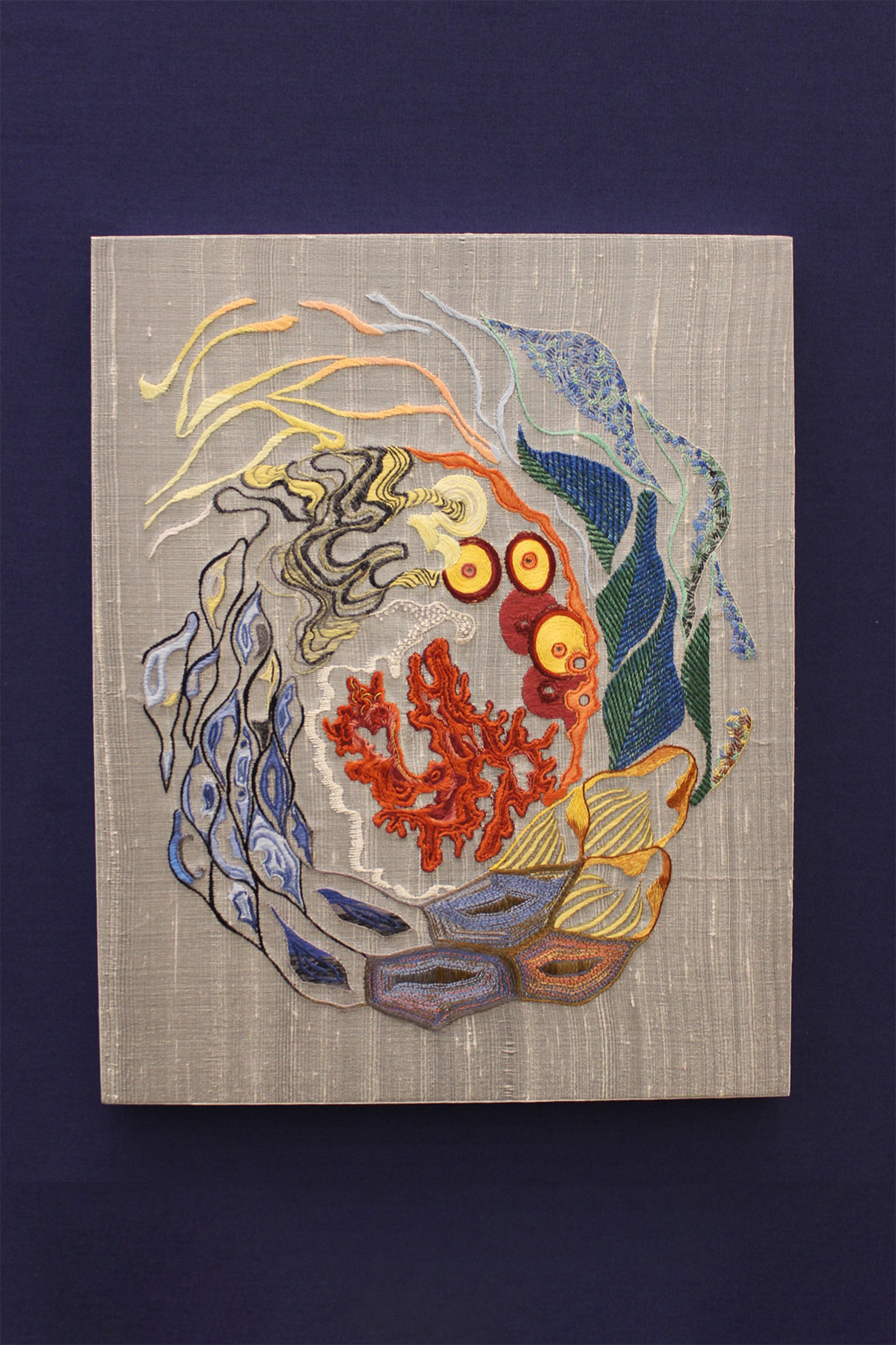 絹糸を使い生地の中に込めていきます。日本刺繍の技法から、